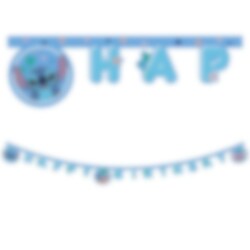 Prachtige blauwe kartonnen slinger met de tekst "Happy Birthday" en schattige Lilo & Stitch-afbeeldingen. De slinger is ca. 2 meter lang en perfect als feestdecoratie voor een kinderfeestje of verjaardag.