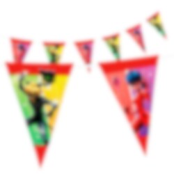 Mooi vlaggenlijn met motieven van Miraculous Ladybug. De vlaggenlijn is gemaakt van plastic en is 5 meter lang en zal een leuke decoratie zijn voor je kinderfeestje.