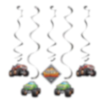 5 st. stoere hangdecoraties met verschillende Monster Truck-motieven. Drie van de decoraties zijn 76 cm lang en twee zijn 99 cm lang.