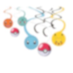 6 hangdecoraties in verschillende kleuren met coole afbeeldingen van de meest iconische karakters uit Pokémon. De decoraties zijn ongeveer 60 cm lang en hebben afbeeldingen aan beide zijden. Ze zijn gemaakt van papier.