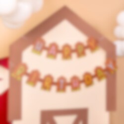 Papieren slinger met de tekst Happy Birthday die een charmante decoratie is voor het kinderfeestje met een boerderijthema. De letters zijn vormgegeven als kleine houten hekjes met kleurrijke details en zijn perfect om een speelse en feestelijke sfeer in de kamer te creëren.