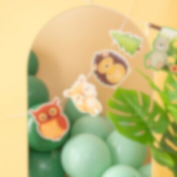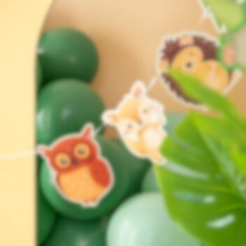 Decoratieve kartonnen slinger, versierd met prachtige afbeeldingen van bosdieren. Ideaal om op te hangen bij een kinderfeestje met een bosthema.