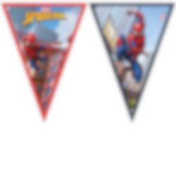 Papieren vlaggenlijn met afbeeldingen van Spiderman die met zijn stoere spinnenweb van gebouw naar gebouw slingert. Een stijlvolle decoratie om op te hangen in de feestzaal voor een feestelijke sfeer.