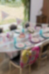 Kleurrijke tafelloper met een patroon van een lief eenhoorn en kleine details zoals harten en sterren. Leuk om de tafel mee te dekken voor je kinderfeestje met een eenhoorn thema. De tafelloper is gemaakt van polyester en is ongeveer 30 cm breed en 5 meter lang.