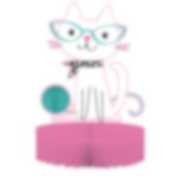 Roze honeycomb-tafeldecoratie met een afbeelding van een spinnende kat. Een prachtige decoratie om de tafel mee aan te kleden voor een kattenthema-kinderfeestje. De decoratie is ongeveer 23 x 30 cm groot.