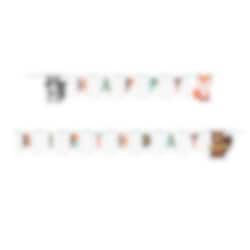 Grote kartonnen slinger met de tekst "Happy Birthday" en motieven van een wasbeer, een vos en een bever uit het thema Woodland Animals. Versier de muur hiermee als je een kinderfeestje hebt met Woodland Animals als thema. De slinger is ongeveer 2,50 meter lang en de motieven zijn ongeveer 15 cm groot.