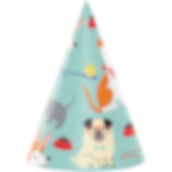 8 mintgroene feesthoedjes met motieven van verschillende honden. Een leuk accessoire om mee te nemen naar het kinderfeestje met een hondenthema. De hoedjes zijn gemaakt van karton en zijn ongeveer 10 cm hoog. Wordt vastgemaakt met een elastische band.