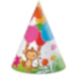 6 feesthoedjes van karton met motieven van kleurrijke ballonnen en verschillende grappige dieren. De hoedjes zijn ongeveer 19 cm hoog en worden op hun plaats gehouden met een elastische band.
