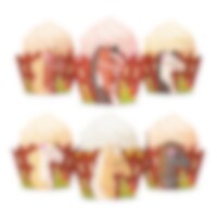 Geef cupcakes een feestelijke uitstraling met deze schattige wikkels met paardenthema. Ze lijken op kleine houten hekken en zijn versierd met vrolijke paarden – perfect voor een kinderfeestje in boerderijstijl. De wikkels zijn 7,5 cm breed en ongeveer 5 cm hoog en passen gemakkelijk rond gebakken cupcakes.