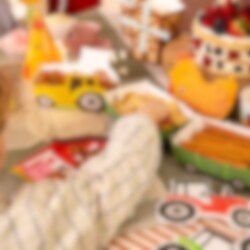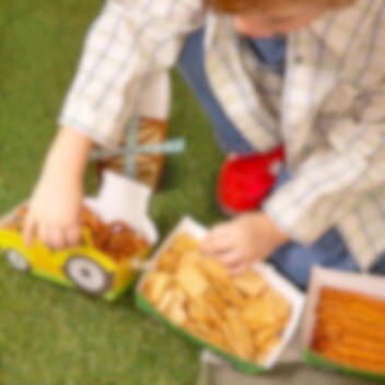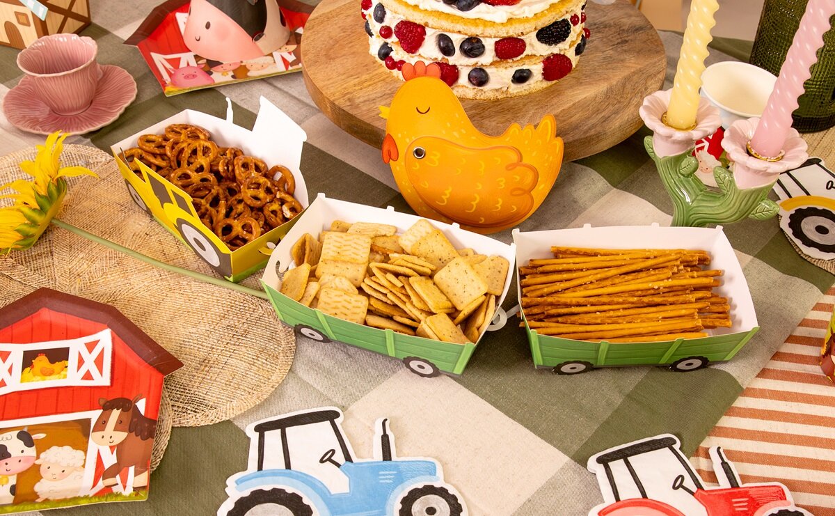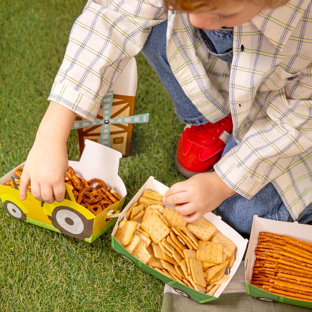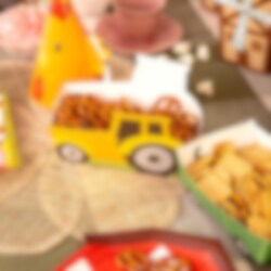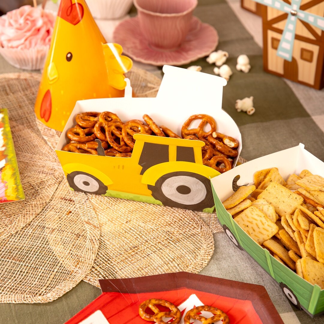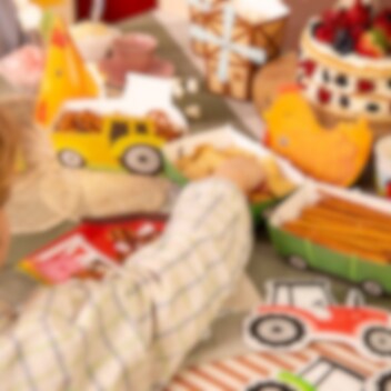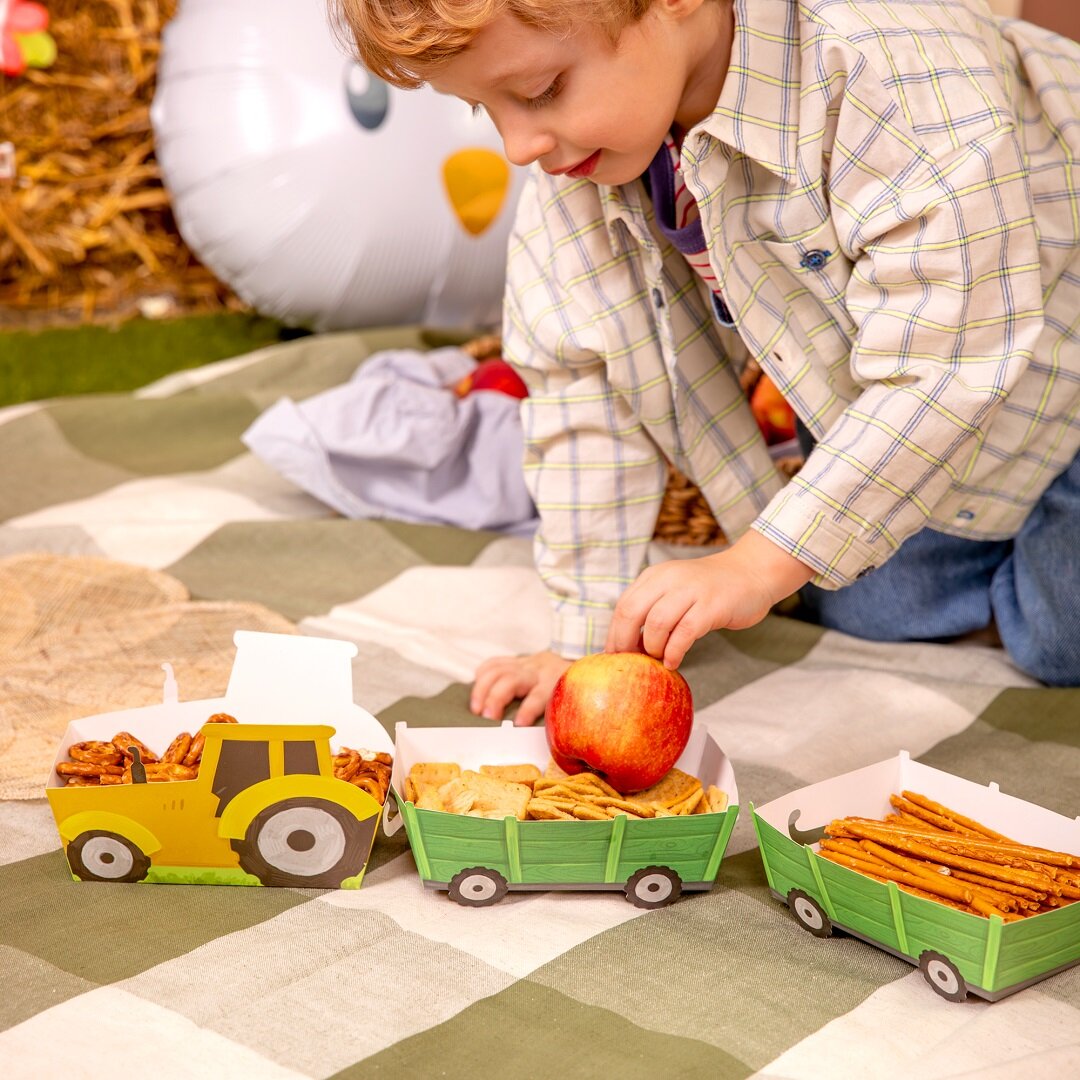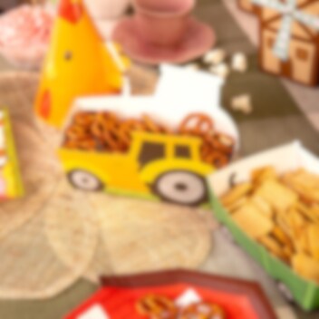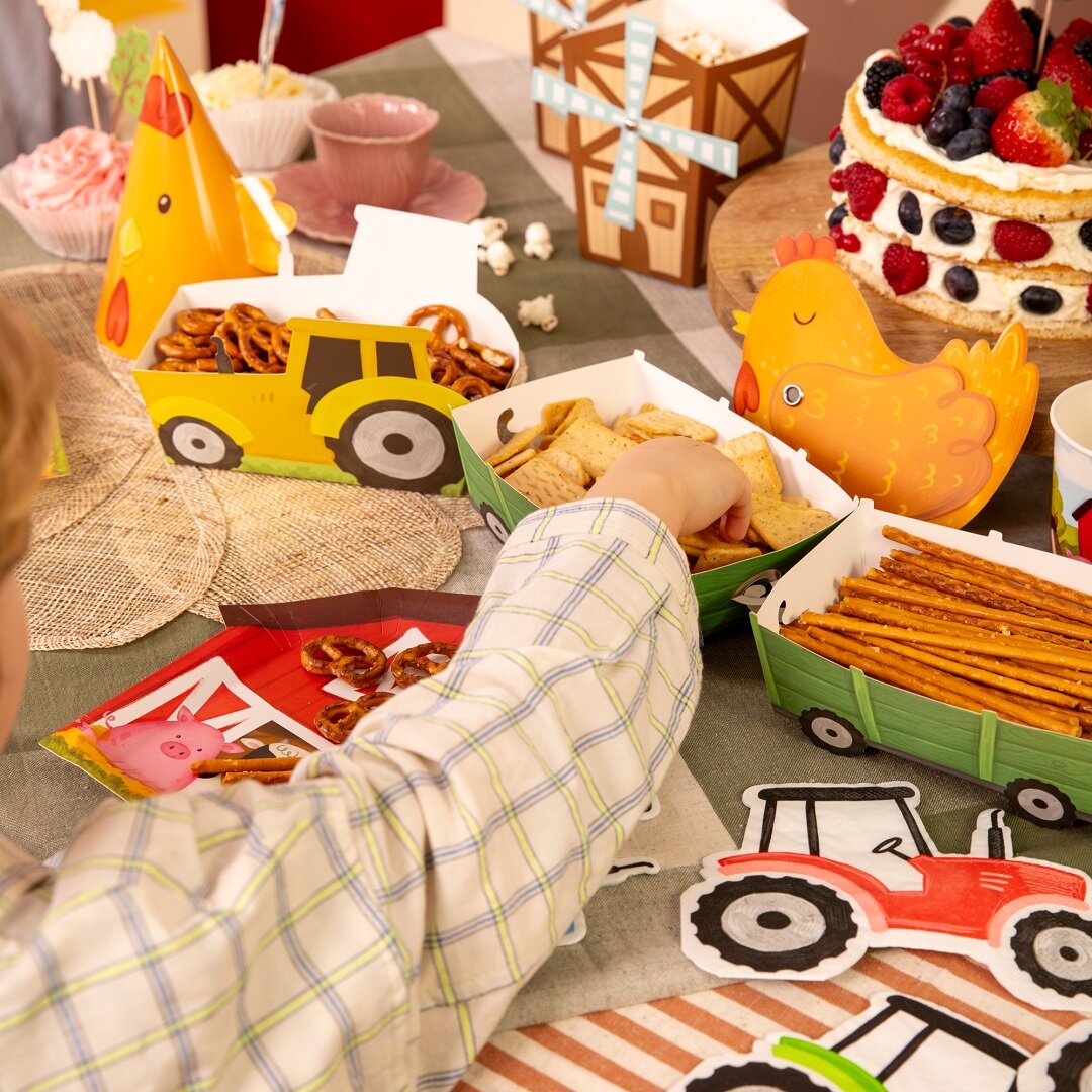 Deze set van 3 snacksdoosjes, bestaande uit een tractor en twee bijbehorende wagens, vormt een speels en opvallend detail op de kinderfeesttafel. Ze passen perfect bij een kinderfeestje met boerderijthema en maken het serveren extra leuk voor kleine gasten.