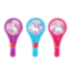 Leuk miniracket met stijlvolle afbeeldingen van eenhoorns. Voorzien van een bal aan een elastisch koord. Perfect om in een feesttas te stoppen en uit te delen aan vrienden tijdens een kinderfeestje.