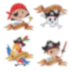 4 vel met stickers met verschillende stoer piratenmotieven. Perfect om je vrienden mee te verrassen uitdeelzakjes of waarom niet als vulling voor je piñata.