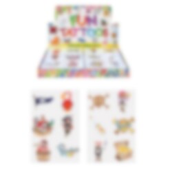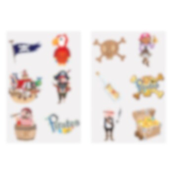 Set van 6 tijdelijke neptattoos met stoere piratenafbeeldingen zoals een papegaai, piratenschip en schatkist. Leuk om uit te delen tijdens een kinderfeestje of om mee te geven in een uitdeelzakje. Let op: de tattoos zitten op twee verschillende velletjes en worden willekeurig en ongesorteerd geleverd.