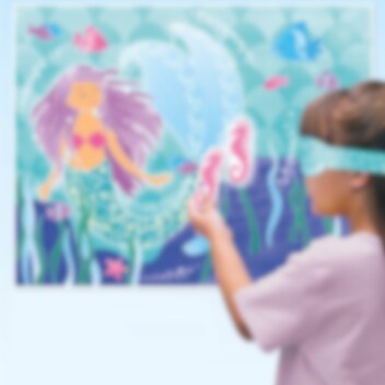 Leuk spelletjes voor 2-16 spelers met een zeemeermin thema. Hier moeten de deelnemers proberen een zeepaardje vast te pinnen. Wie het dichtst in de buurt komt, wint. Het pakket bevat een plastic speelveld (48 x 38 cm), 14 stuks stickers (genummerde zeepaardjes) en een blinddoek.
