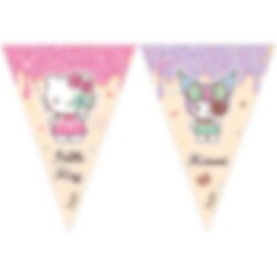 Kleurrijke vlaggenlijn van papier met afbeeldingen van Hello Kitty en Kuromi. Een mooie decoratie om een leuke sfeer te creëren op het kinderfeestje!