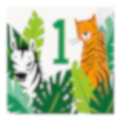 16 stuks 1-jarige servetten in wit met motieven van schattige kleine safaridieren in de jungle. Stijlvol om op tafel te zetten als het tijd is voor een kinderfeestje. Past perfect bij onze andere accessoires uit het thema safari.