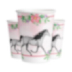 8 papieren bekers in de kleuren roze en wit met prachtige afbeeldingen van paarden en bloemen. Een chique accessoire om de tafel te dekken voor je paarden-kinderfeestje. De bekers zijn ongeveer 10 cm hoog en hebben een inhoud van 250 ml.