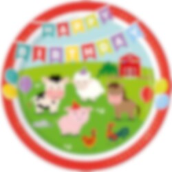 8 papieren bordjes met rode randen en motieven van schattige boerderijdieren en een kleurrijke slinger met de tekst "Happy Birthday" en ballonnen. Zet deze op tafel voor het kinderfeestje met boerderijthema.