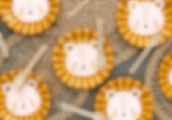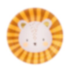 8 papieren bordjes met een motief van een leeuw met goudfolie oren. De bordjes zijn 18 cm in doorsnee.