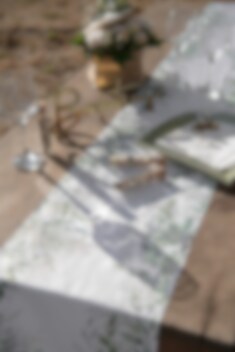 Mooie tafelloper met verfijnde motieven van groen gebladerte en goudgefolieerde details in reliëf. Dek de tafel mooi met deze voor een chiquere gelegenheid of zomerfeest.