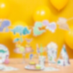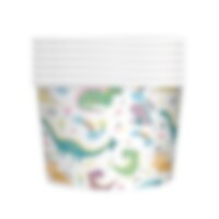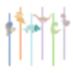 6 kleurrijke kartonnen rietjes versierd met grappige dinosaurussen. De rietjes zijn ongeveer 20 cm lang en de afbeeldingen hebben een diameter van ongeveer 4 cm.
