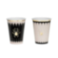 Maak je Halloweentafel compleet met elegante kartonnen bekers. Elke beker is versierd met een glanzende gouden spin en heeft een decoratieve rand met goudfolie voor een luxe uitstraling. De set bevat twee verschillende ontwerpen die passen bij de andere producten uit dezelfde serie.
