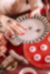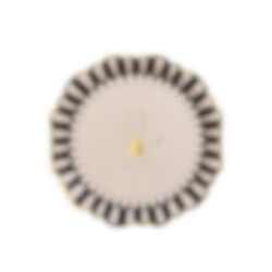 Zorg voor een stijlvolle Halloweentafel met elegante papieren borden. De zachte achtergrondkleur laat de glanzende gouden spin in het midden opvallen, terwijl de golvende rand zwarte strepen heeft en eindigt met een rand in goudfolie voor een luxe accent.