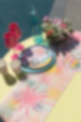 Pastelkleurige en mooie tafelloper die met zijn ontwerp de gedachten naar een warmere plaats met prachtige palmbomen brengt. De tafelloper is perfect als je een leuke zomerfeest wilt organiseren.