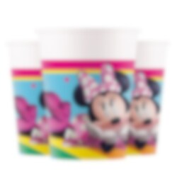 8 papieren bekers met vrolijke afbeeldingen van Minnie Mouse in heldere kleuren. Ideaal om een leuke en vrolijke tafelschikking te creëren voor een kinderfeestje met Minnie Mouse-thema.