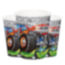 8 papieren bekers met stoere Monster Truck motieven. De bekers zijn ongeveer 10 cm hoog en hebben een inhoud van ongeveer 266 ml.