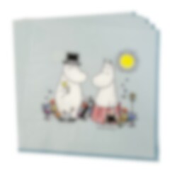 16 charmante servetten in blauwe tinten met afbeeldingen van de Moomins, die de gasten meenemen op een betoverend avontuur in de Moominvallei.