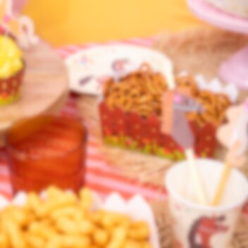 Breng een vleugje boerderijfeest naar de tafel met deze schattige snackboxen met hekwerkdesign. Versierd met hoefijzers, bloemen en landelijke details zijn ze ideaal voor chips, popcorn of stukjes fruit tijdens een paardenfeestje. De dozen zijn gemaakt van karton en hebben een formaat van 15 x 10 x 7,5 cm – handig én decoratief.