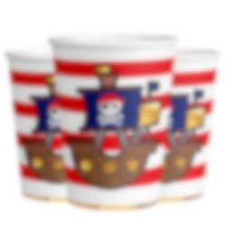 8 papieren bekers met rode en witte strepen en met motieven van een stijlvol piratenschip met goudfolie details. Heerlijk om bij je te hebben om de tafel te dekken voor het kinderfeestje met een piraten thema.