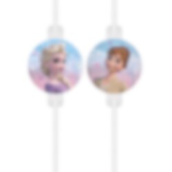 4 kartonnen rietjes met afbeeldingen uit de film Frozen. De rietjes zijn ongeveer 21 cm lang en de afbeeldingen hebben een diameter van 6,5 cm.