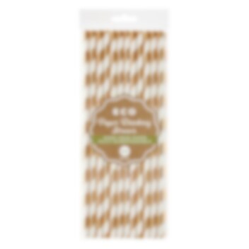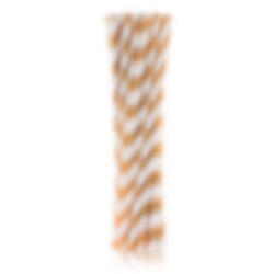 24 witte kartonnen rietjes met roségouden strepen. De rietjes zijn ongeveer 20 cm lang.