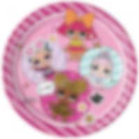 8 papieren borden in roze tinten. De bordjes hebben in het midden motieven van de Glitterati bende van LOL Surprise en de randen hebben strepen in roze en metallic. De borden hebben een diameter van ongeveer 23 cm.