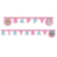 Decoratieve slinger van papier in roze tinten met aan één zijde motieven van de poppen Crystal Queen, Luxe en Splash Queen en de tekst "Happy Birthday" in de kleuren roze en pastelblauw. Een mooie decoratie om aan de muur te hangen als er een kinderfeestje is met LOL Surprise als thema. De slinger is ongeveer 2 meter lang.