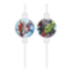 4 papieren rietjes met coole afbeeldingen van Iron Man, Captain America, de Hulk en Thor uit de Avengers. Leuk om op te zetten voor het Avengers kinderfeestje. De rietjes zijn ongeveer 21 cm lang en de motieven hebben een diameter van ongeveer 6,5 cm.