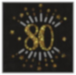 10 zwarte servetten met decoratieve patronen en het getal '80' in goudglitter. Deze servetten zijn perfect voor het dekken van een feest ter ere van een 50e verjaardag. De servetten hebben drie lagen en voelen luxe aan. Uitgevouwen hebben ze een afmeting van 16,5 x 16,5 cm.