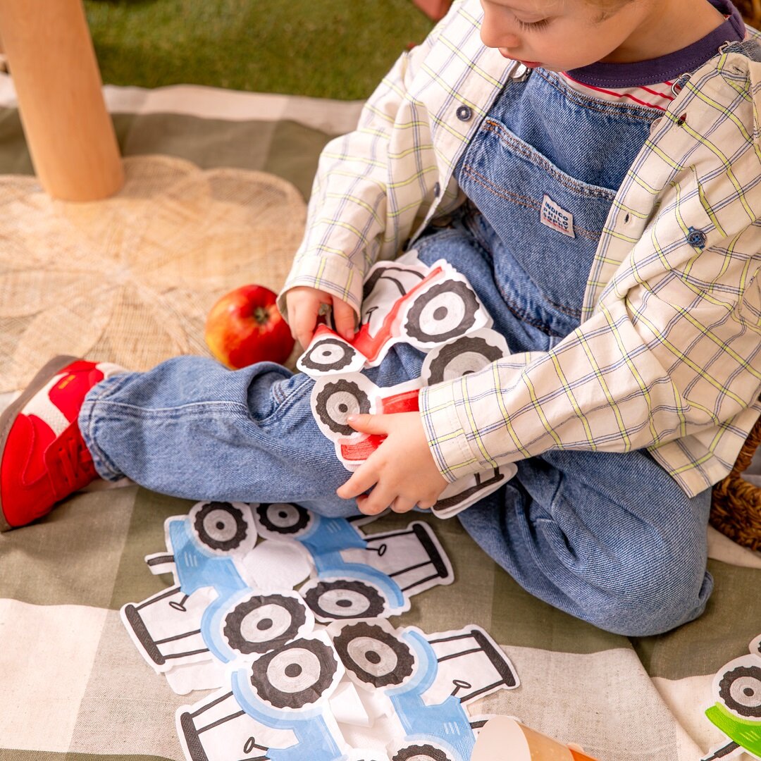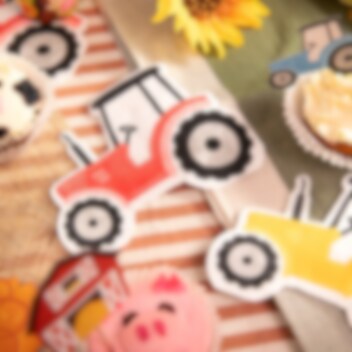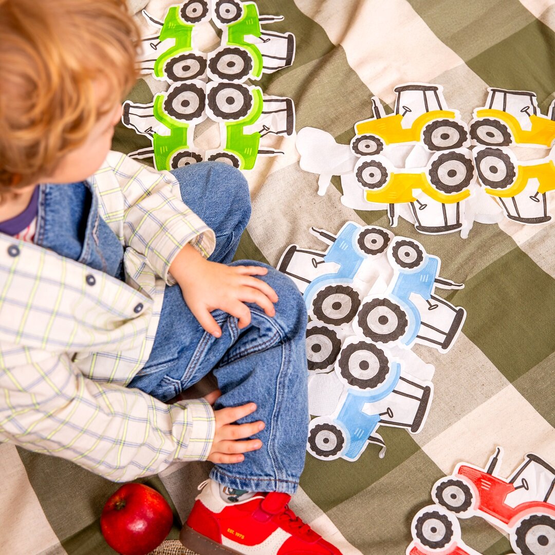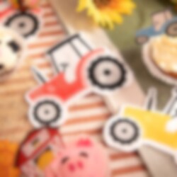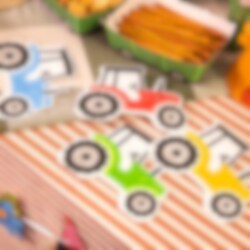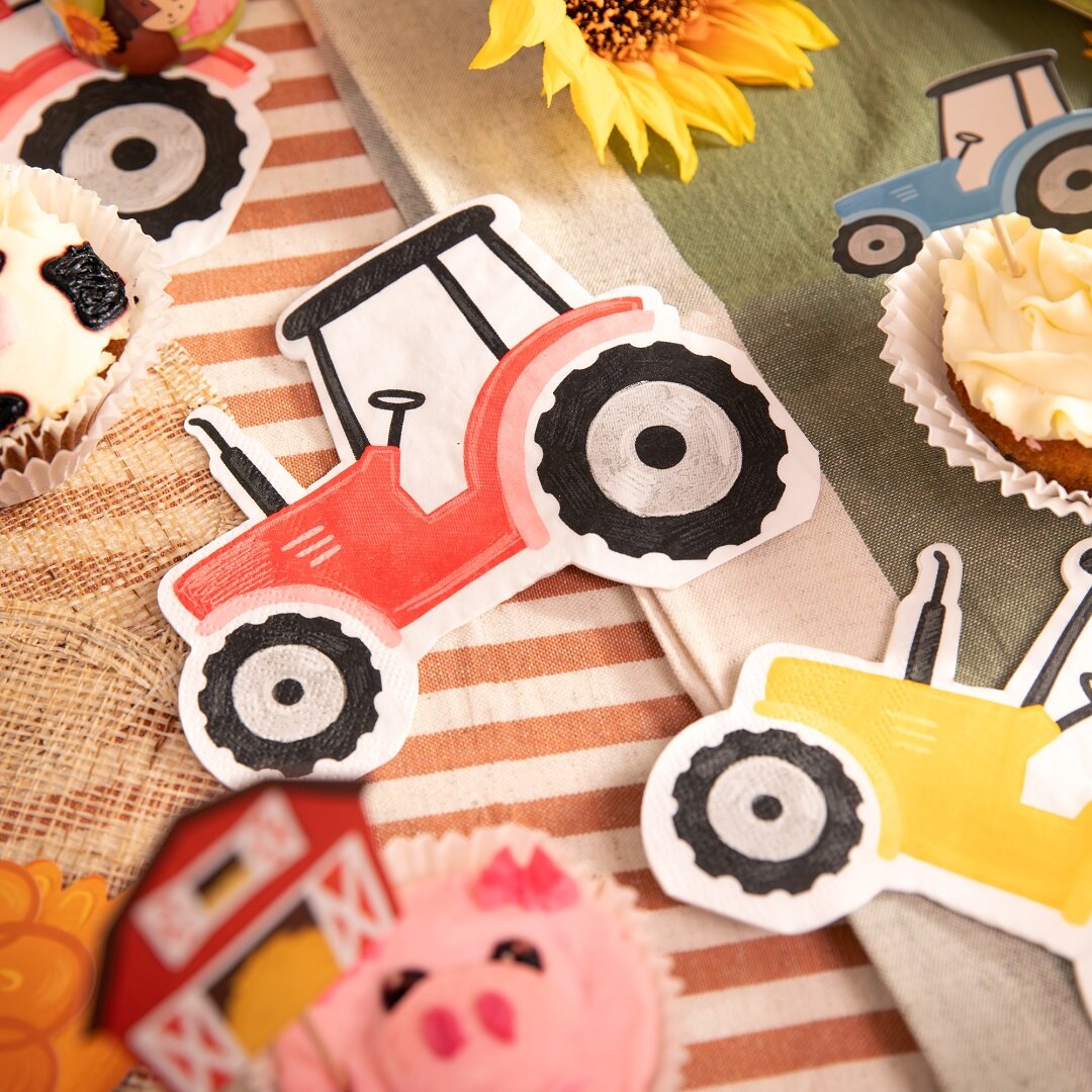 12 servetten gevormd als kleine tractoren, die een speels en charmant detail vormen op tafel voor het kinderfeestje. De kleurrijke tractoren in groen, blauw, rood en geel passen perfect bij een kinderfeestje met een boerderijthema en maken de tafel extra feestelijk.