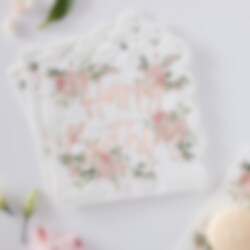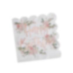 16 leuke servetten met een lief motief van bloemen en de tekst "Happy Birthday" in roségoudfolie aan één kant. De servetten hebben 2 lagen en zijn uitgevouwen 33 x 33 cm.