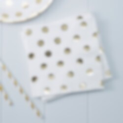 20 stijlvolle servetten in wit met stippen van hoogglans goudfolie. De servetten zullen een leuk detail zijn voor het gedekte feest of party-tafel. De servetten hebben 3 lagen en zijn uitgevouwen 33 x 33 cm.