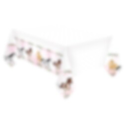 Leuk kunststof tafelkleed in roze kleuren met afbeeldingen van schattige paarden tussen bloemen. Een chique tafelaankleding als aanvulling op je kinderfeestje met paardenthema.