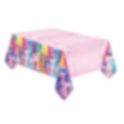 Schattig kleurrijk tafelkleed van papier met afbeeldingen van de paarden uit My Little Pony. Het tafelkleed is 120 x 180 cm groot.