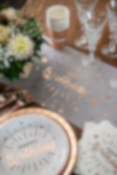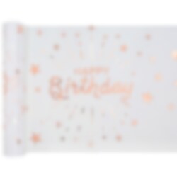 Zeer mooie tafelloper in witte kleur met een chique motief van de tekst "Happy Birthday" en sterren in roségoudfolie die de perfecte decoratie zal zijn voor elk feest of kinderfeestje.
