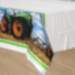 Groot en stoer plastic tafelkleed met tractor motief. Dek de tafel hiermee af om hem te beschermen tegen het morsen van feestjes, terwijl het ook een leuke decoratie is. Het tafelkleed is ongeveer 137 x 259 cm groot.
