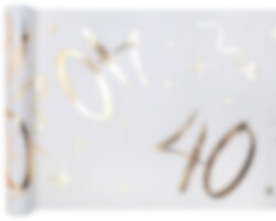 Witte tafelloper met decoratieve patronen en het getal '40' in goudfolie. Deze tafelloper komt in een handige rol en is 30 cm breed en maar liefst 5 meter lang. Het is genoeg voor meerdere tafels en een groot feest. Het materiaal is 100% polyester.