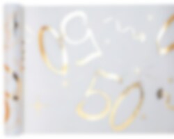 Witte tafelloper met decoratieve patronen en het getal '50' in goudfolie. Deze tafelloper komt in een handige rol en is 30 cm breed en maar liefst 5 meter lang. Het is genoeg voor meerdere tafels en een groot feest. Het materiaal is 100% polyester.
