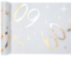 Witte tafelloper met decoratieve patronen en het getal '60' in goudfolie. Deze tafelloper komt in een handige rol en is 30 cm breed en maar liefst 5 meter lang. Het is genoeg voor meerdere tafels en een groot feest. Het materiaal is 100% polyester.