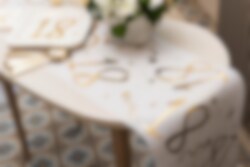 Witte tafelloper met decoratieve patronen en het getal '70' in goudfolie. Deze tafelloper komt in een handige rol en is 30 cm breed en maar liefst 5 meter lang. Het is genoeg voor meerdere tafels en een groot feest. Het materiaal is 100% polyester.